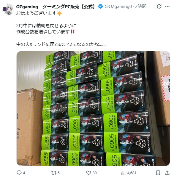 | … | 25無念Nameとしあき26/01/21(水)11:03:49No.1381660148そうだねx1>>よく見たら5060ti8GBだったでござるよ |