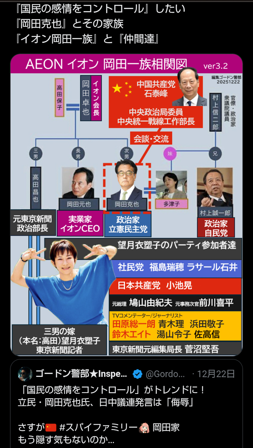 | … | 106無念Nameとしあき26/01/21(水)15:37:33No.1381704673+政権交代で日本をぐちゃぐちゃにするのが目的です? |