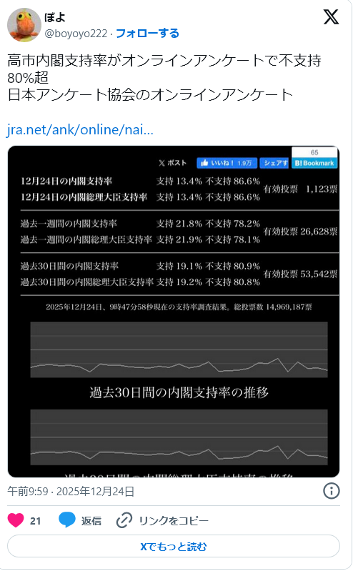 | … | 991無念Nameとしあき26/01/21(水)19:54:53No.1381754943+>高市さんになったら自民支持率もっと上がると思ったけど意外と上がらんなぁ |