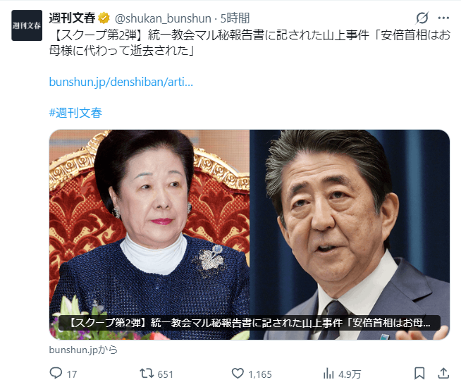 | … | 212無念Nameとしあき26/01/21(水)18:59:24No.1381739732そうだねx3 1768989564368.png-(358697 B) >結局統一教会と安倍はどこまで関係あったの? |
