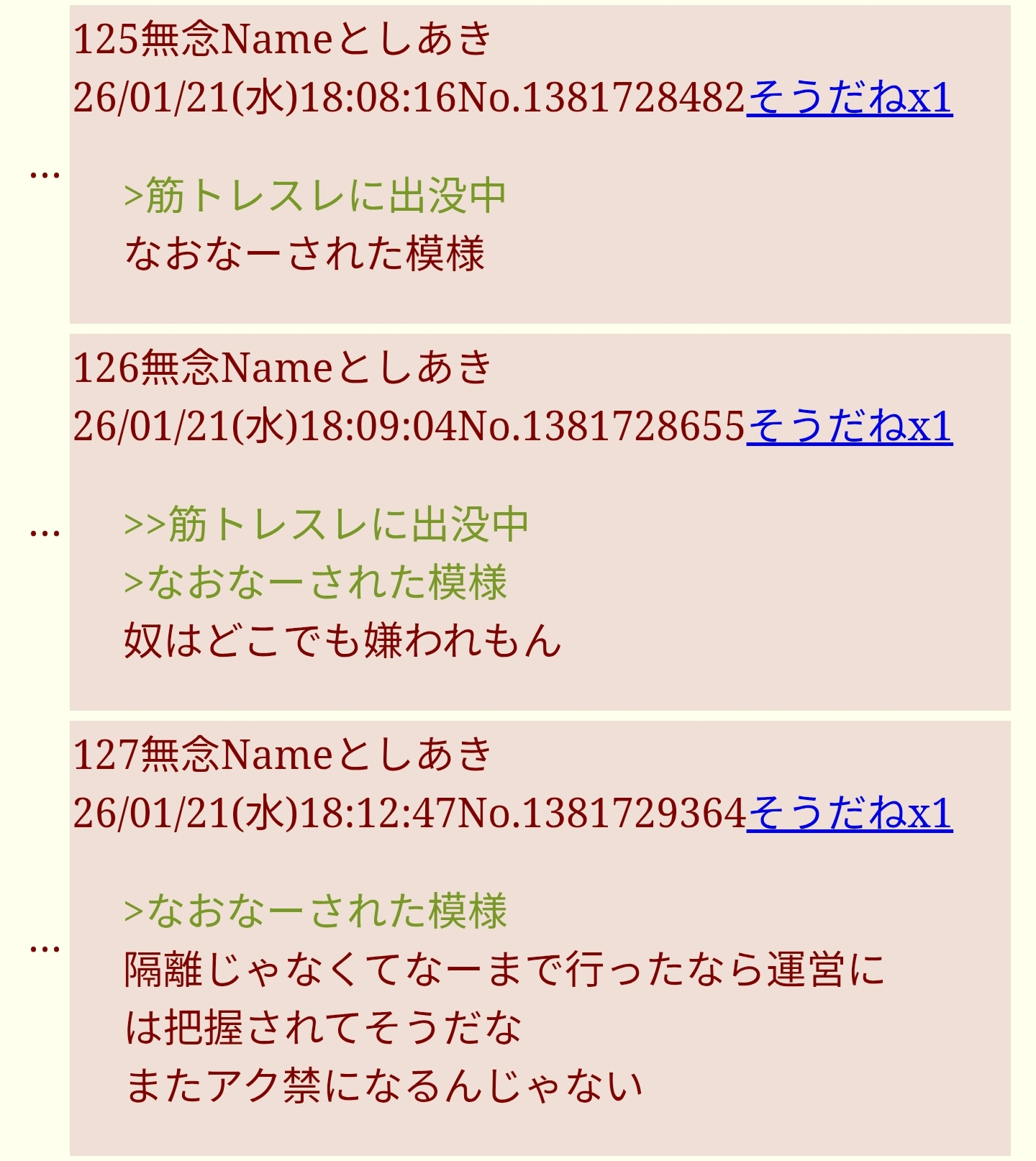 | … | 50無念Nameとしあき26/01/21(水)21:38:15No.1381787728+>てか汗爺のブレソル引退メッセージとアク禁中の避難先の筋肉掲示板のお別れメッセージ全く同じっすね |