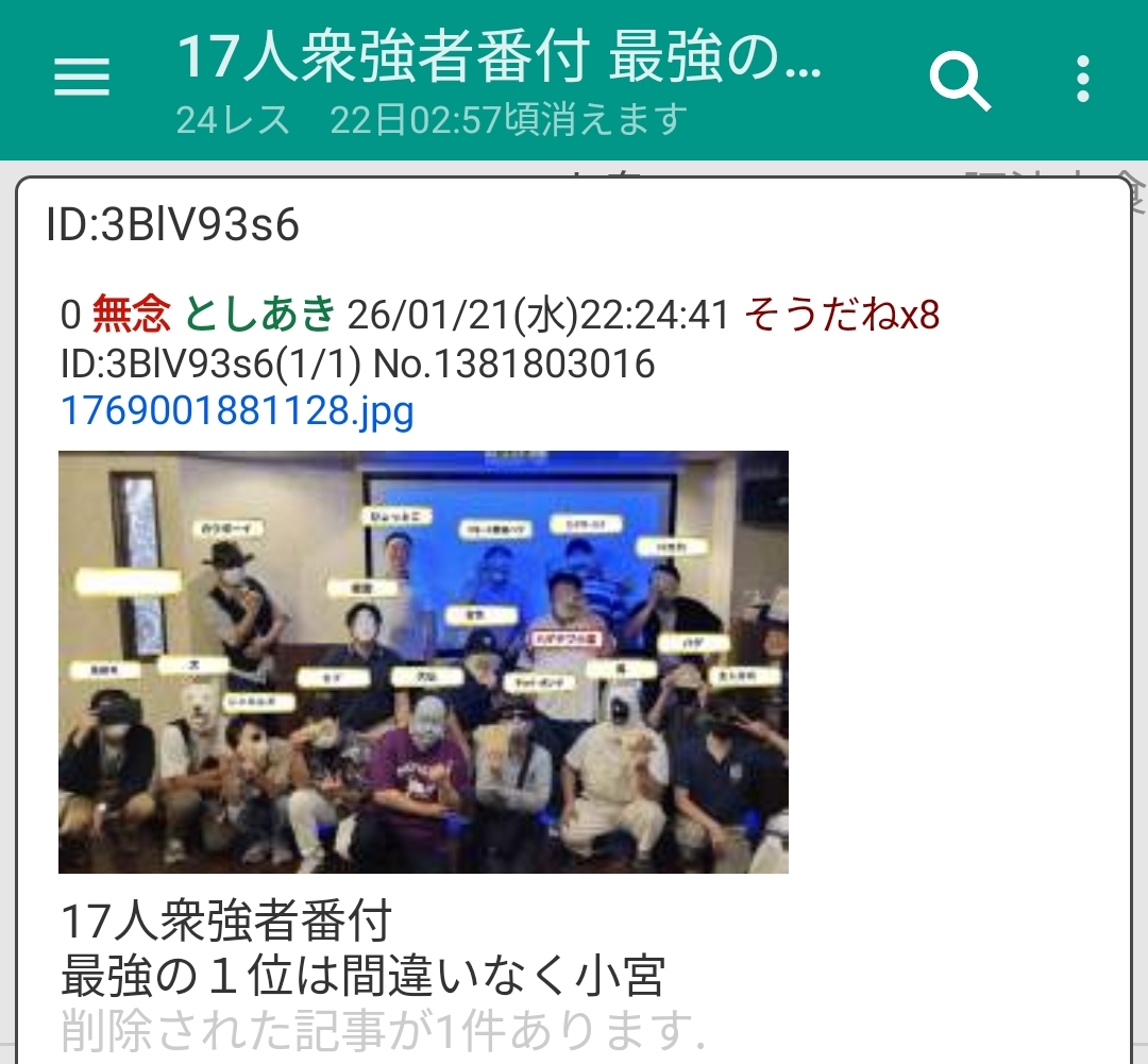 | … | 50無念Nameとしあき26/01/22(木)02:52:36No.1381844590そうだねx1偉大なるふたばの守護者たる17人のハゲ |