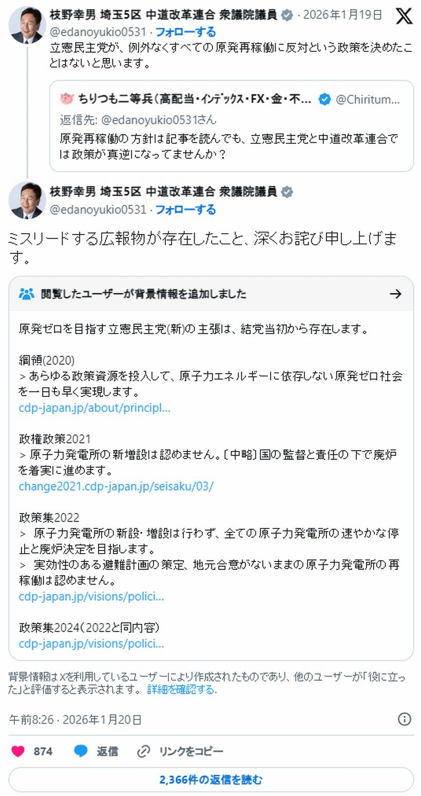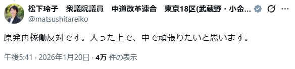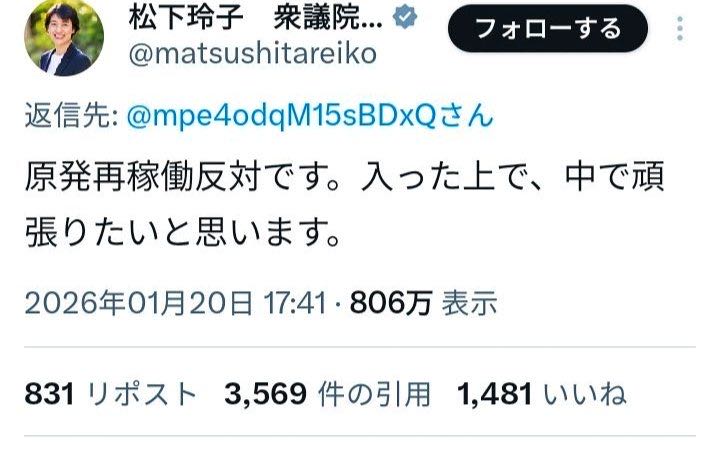 | … | 66無念Nameとしあき26/01/21(水)23:23:56No.1381818841そうだねx5>基本政策が中道寄りになった事で原発も憲法改正も容認か〜 |