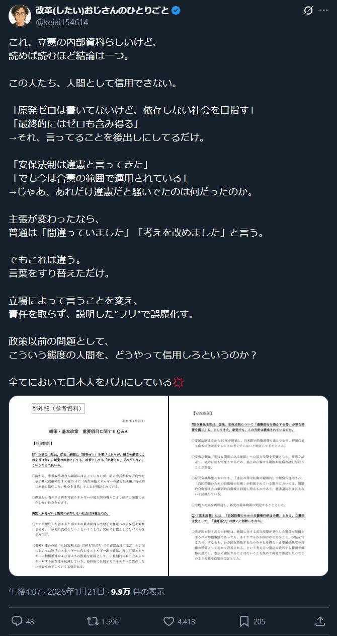 | … | 27無念Nameとしあき26/01/21(水)23:00:44No.1381813278+>与党になったら賛成推進で野党になったら反対するって言ってたんだっけ |