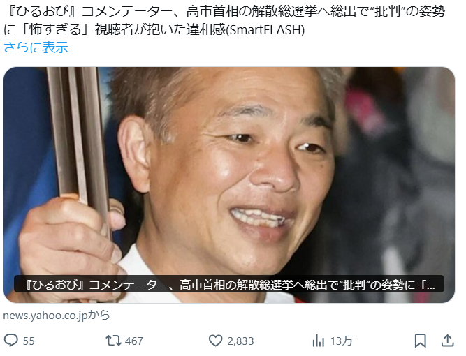 | … | 883無念Nameとしあき26/01/22(木)03:36:53No.1381846123+>テレビだと歓迎ムードなの謎すぎるんだよね |