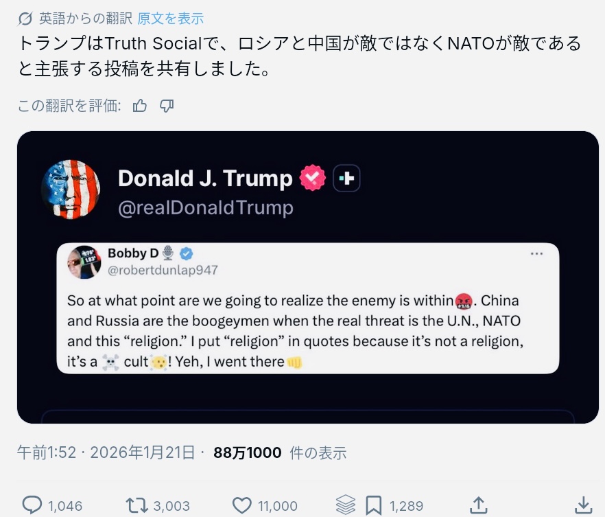 | … | 763無念Nameとしあき26/01/22(木)01:46:38No.1381840458+ドナルド・トランプ:「NATOはアメリカなしでは何もできない」 |
