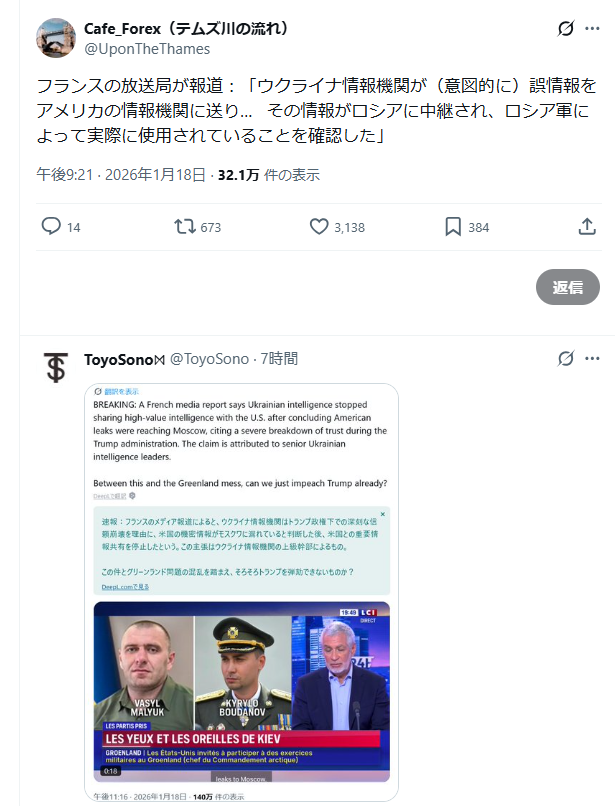 | … | 825無念Nameとしあき26/01/22(木)02:59:39No.1381844914+アメリカについていけば問題ないで今まで通して来たけどこの先アメリカについていく方がリスク高いんじゃ |