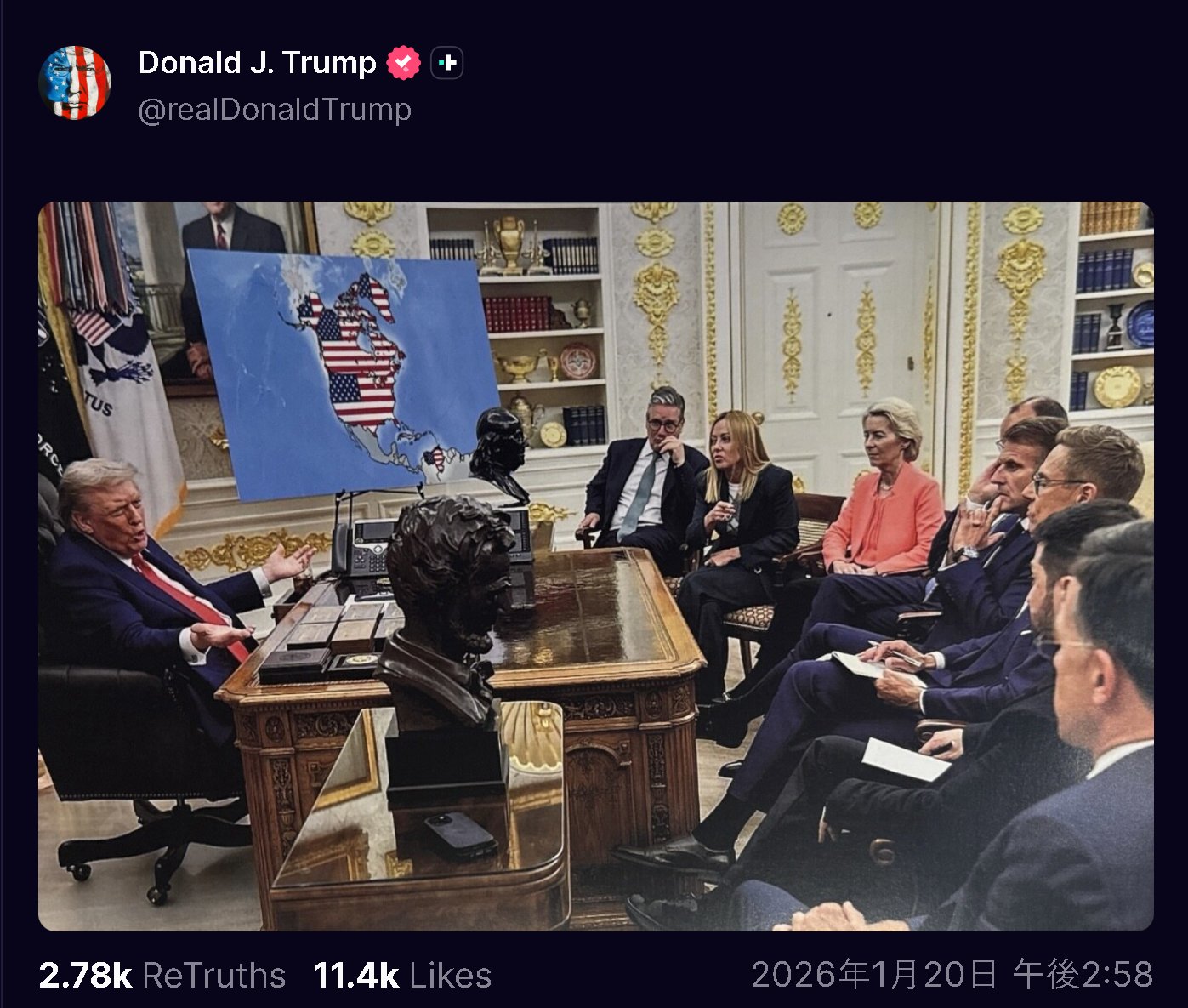 | … | 1無念Nameとしあき26/01/21(水)22:53:49No.1381811381そうだねx3 1769003629584.png-(2500118 B) トランプ大統領はデンマーク等8か国に対して関税を10%引き上げ、6月1日までに25%まで引き上げる予定で、グリーンランドの完全購入成立まで支払いを求め続けると表明 |