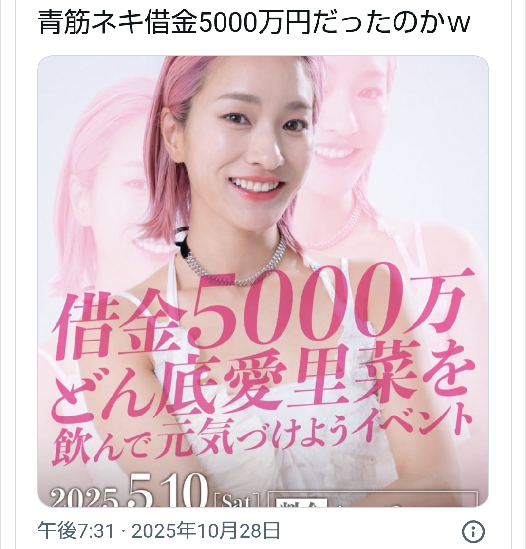 | … | 51無念Nameとしあき26/01/22(木)13:08:46No.1381895335+>なんでピンク髪やめてんだよ |