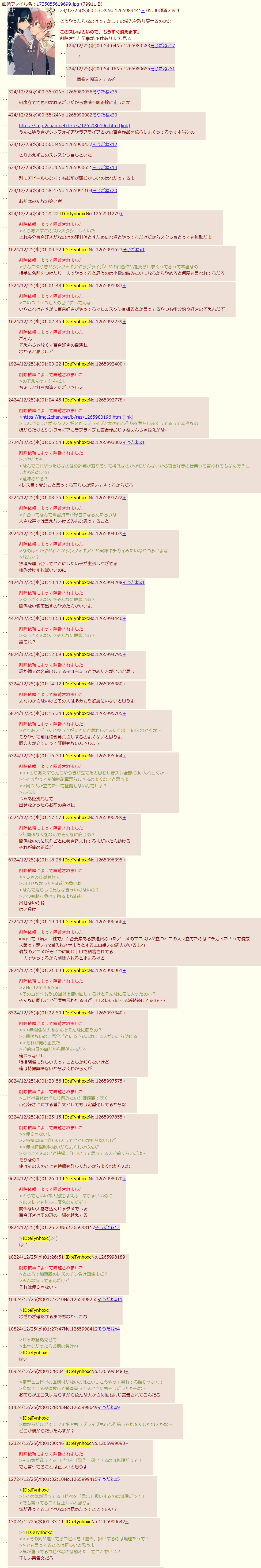 | … | 16無念Nameとしあき26/01/22(木)13:09:59No.1381895550そうだねx4>俺もそう思うけど百合だのレズだのの界隈はすぐモブとセックスさせるなとか消すぞとか殺すぞ |