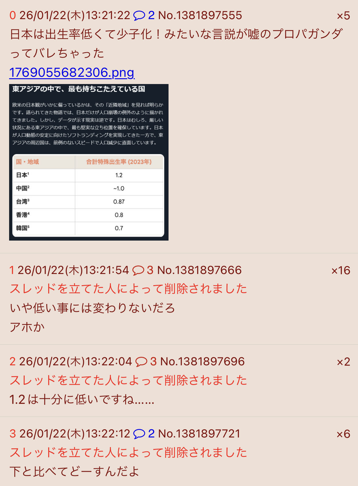 | … | 42無念Nameとしあき26/01/22(木)13:36:12No.1381899989そうだねx12>なんで日本より深刻な中韓に対して少子化って話はしないんですか?? |