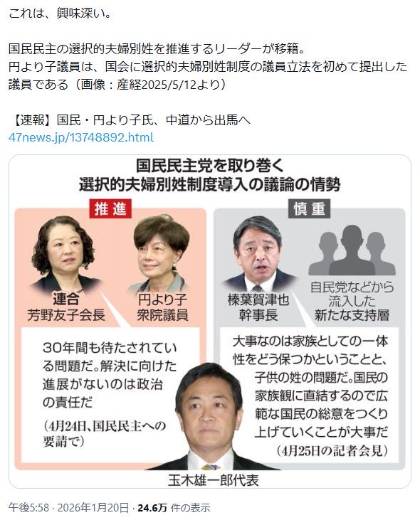 | … | 79無念Nameとしあき26/01/22(木)17:29:53No.1381936022+確かに夫婦別姓や外国人参政権に関しては玉木も昔からレインボーフラッグ掲げて活動しているしな |