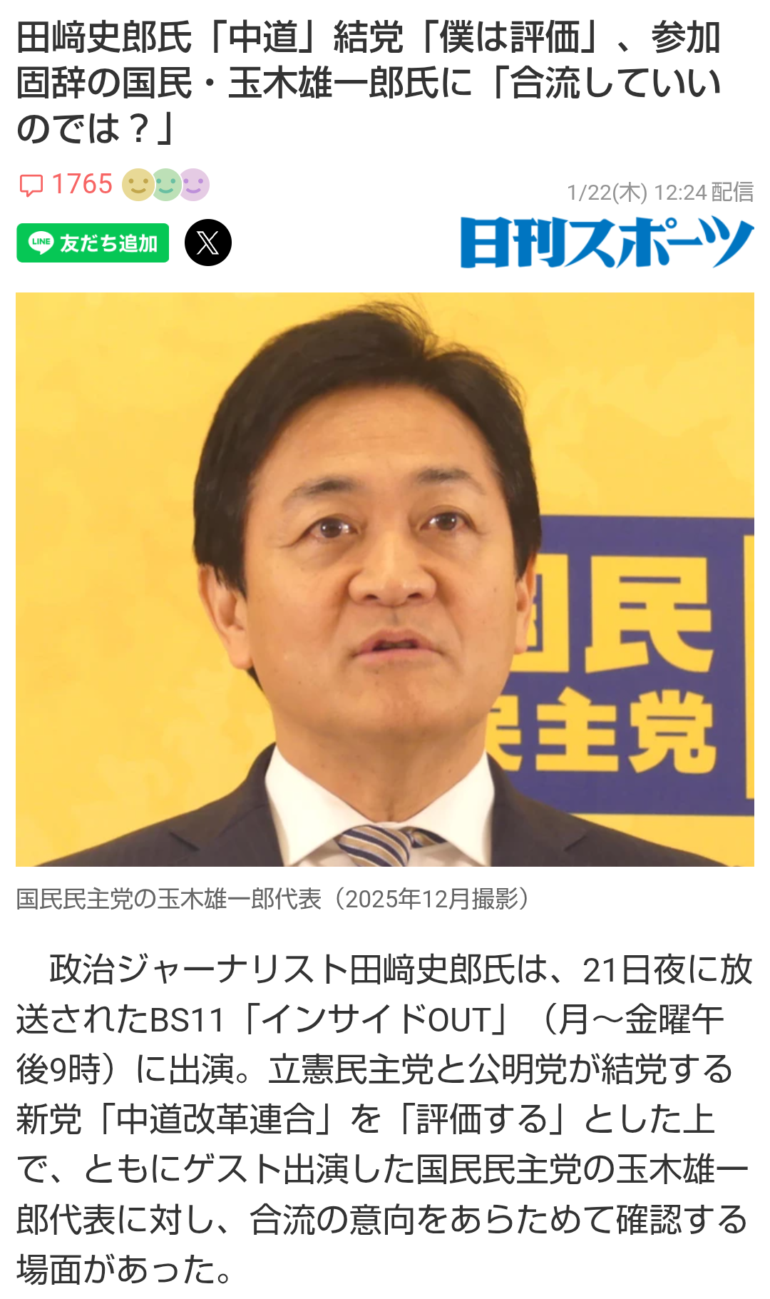 | … | 868無念Nameとしあき26/01/22(木)19:48:09No.1381966880そうだねx1>国民民主党・玉木氏、中道改革連合と連立に含み 「参院の結集見極め」 |