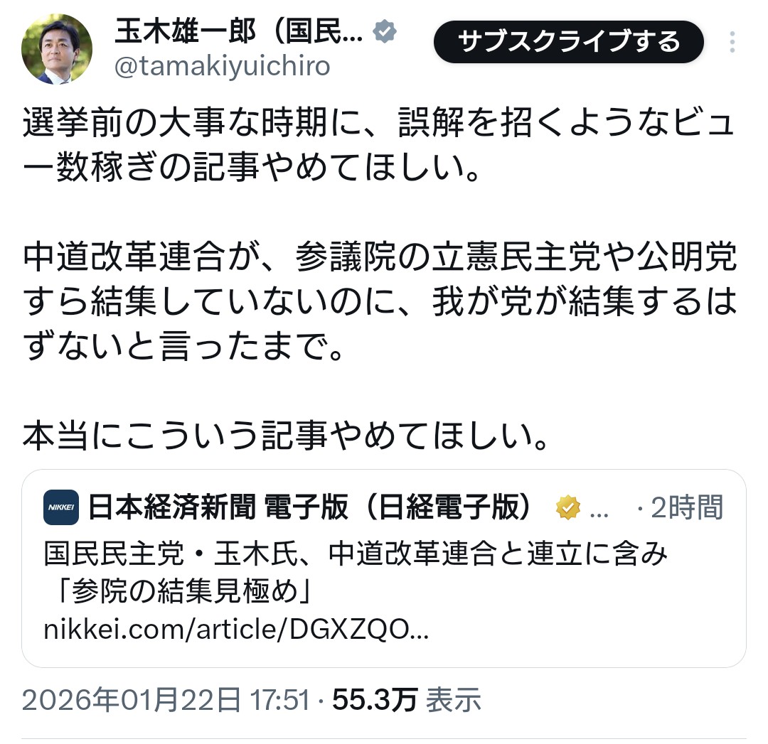 | … | 34無念Nameとしあき26/01/22(木)17:17:04No.1381933873そうだねx3>国民民主党・玉木氏、中道改革連合と連立に含み |