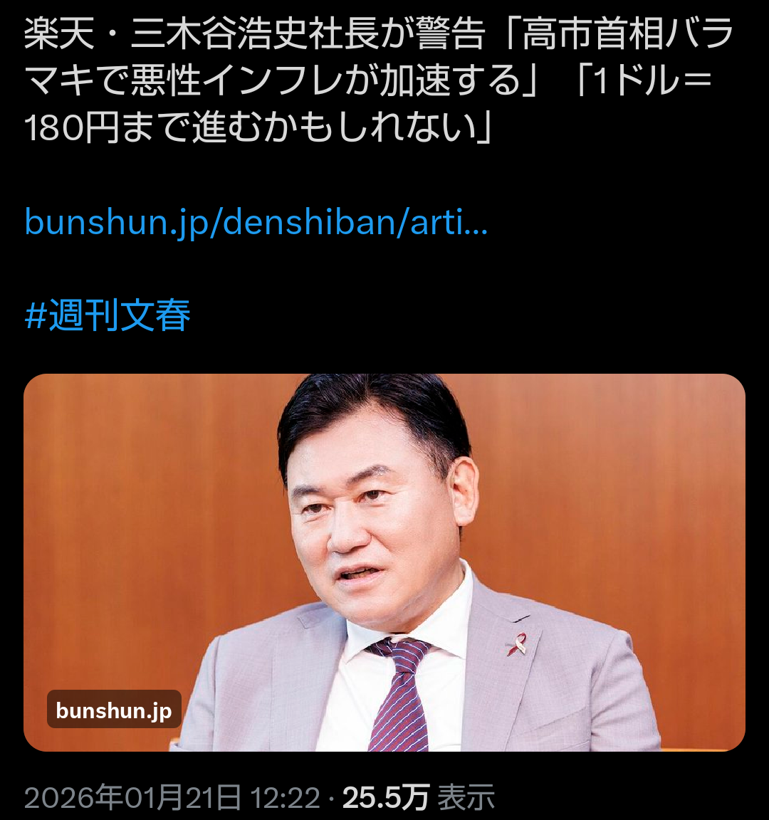 | … | 816無念Nameとしあき26/01/22(木)19:34:20No.1381963404+>ただ三木谷が苦言を呈し始めたから経団連が自民を見限ったら高市大敗だと思う |