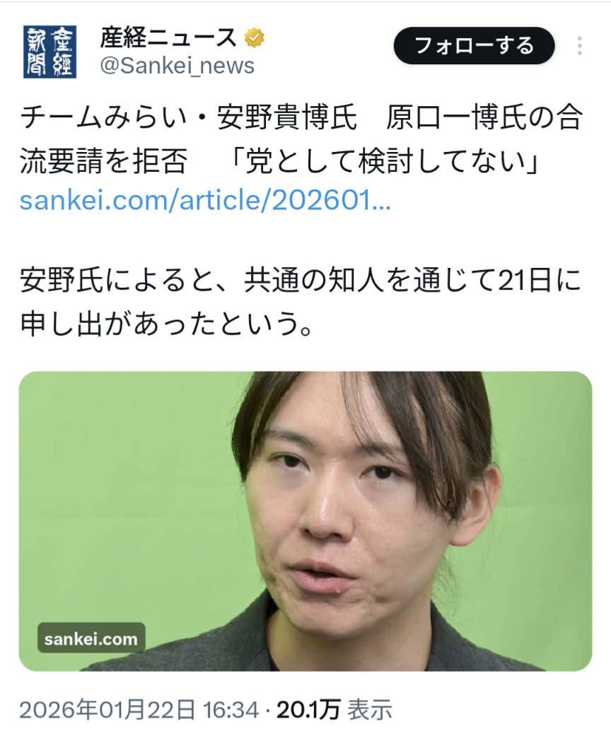 | … | 89無念Nameとしあき26/01/22(木)17:31:21 ID:nFCh/3L.No.1381936268そうだねx3中道国民連立政権は |