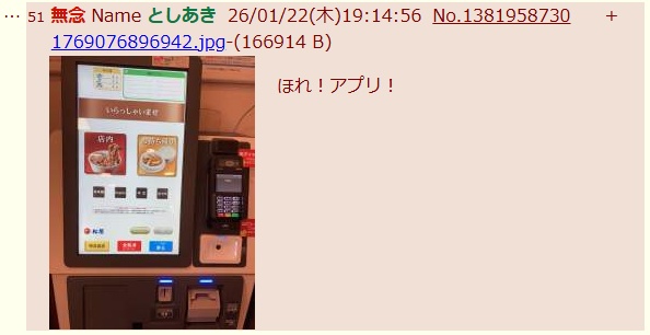 | … | 69無念Nameとしあき26/01/22(木)19:22:51No.1381960580+>一応松屋だったら普通にアプリあるだろうにそれすらスクショ撮れないとか阿呆にも程があるだろ |