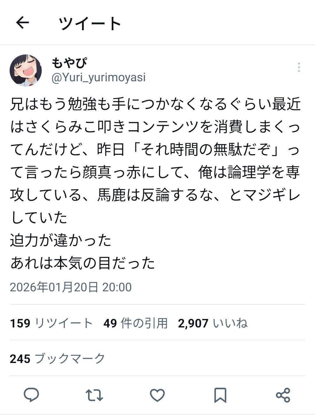 | … | 72無念Nameとしあき26/01/22(木)22:49:22No.1382016365そうだねx4>もし億が一受験受かってても話すネタが「派閥の主さくらみこがさぁwホロライブは悪徳企業でさぁw」とかしかないやつと誰もつるみたくねえだろ |