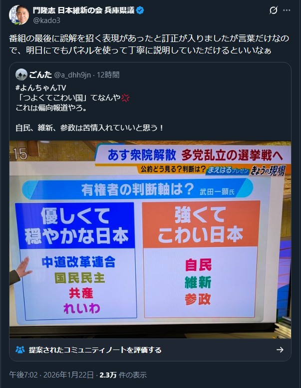 | … | 55無念Nameとしあき26/01/23(金)05:00:40No.1382057580+自民党への援護射撃にしかなってなくて笑うわテレビ |