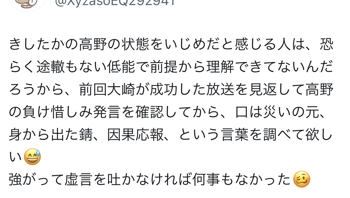 | … | 125無念Nameとしあき26/01/24(土)14:50:45No.1382352299+>>これで高野が叩かれる理由が分からない |