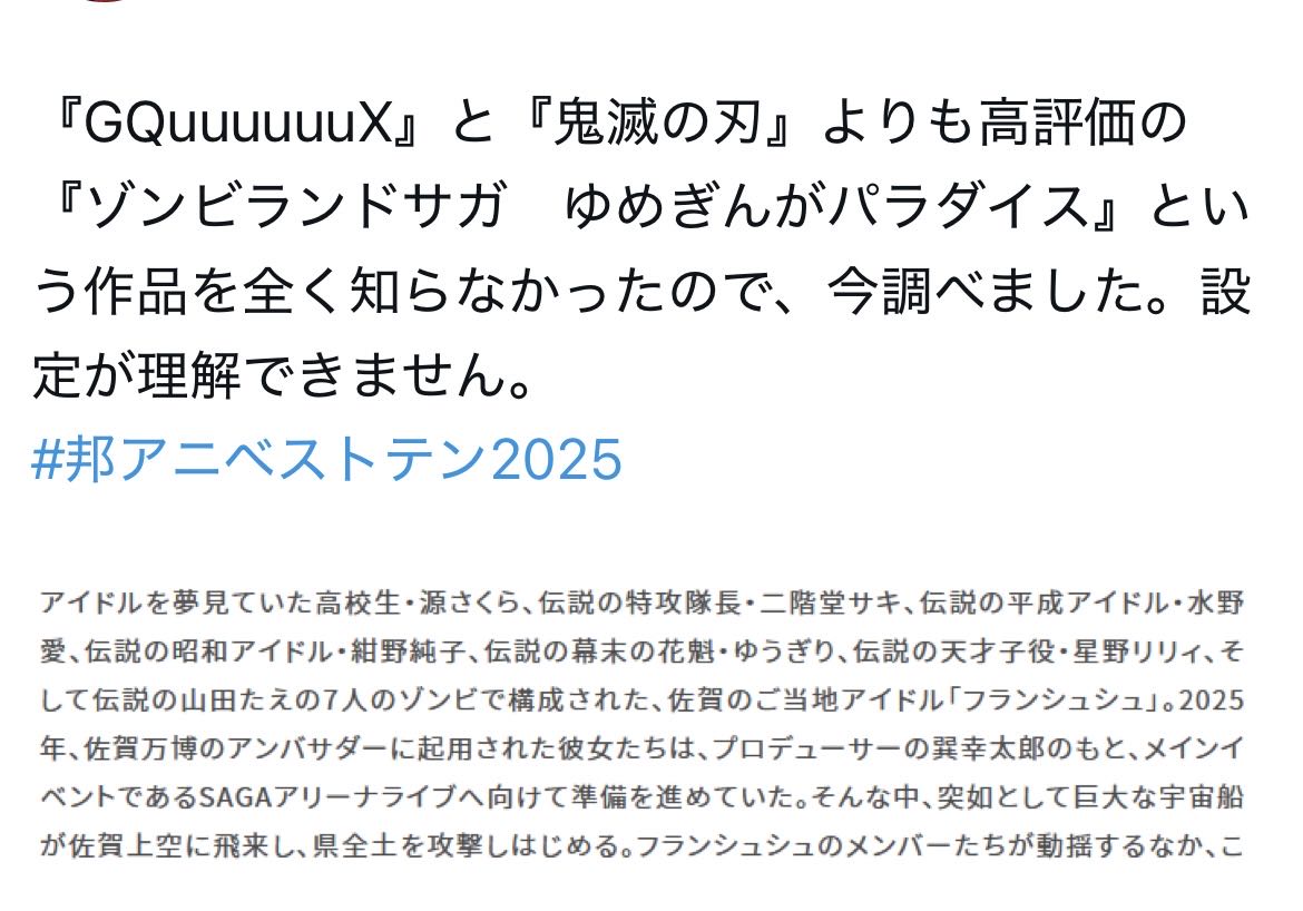 | … | 115無念Nameとしあき26/01/24(土)22:23:19No.1382461242+>ねぇもしかしてゾンビランドサガって町おこし効果歴代1位なんじゃない? |