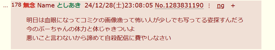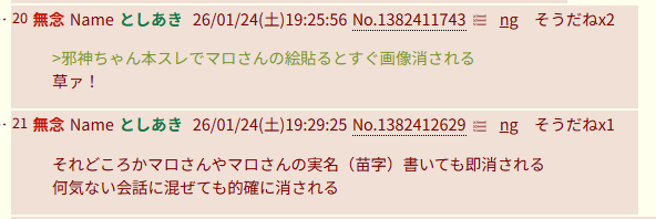 | … | 91無念Nameとしあき26/01/24(土)21:25:55No.1382444571そうだねx4>匿名だからバレないと思ってるんだろうがやりすぎ |