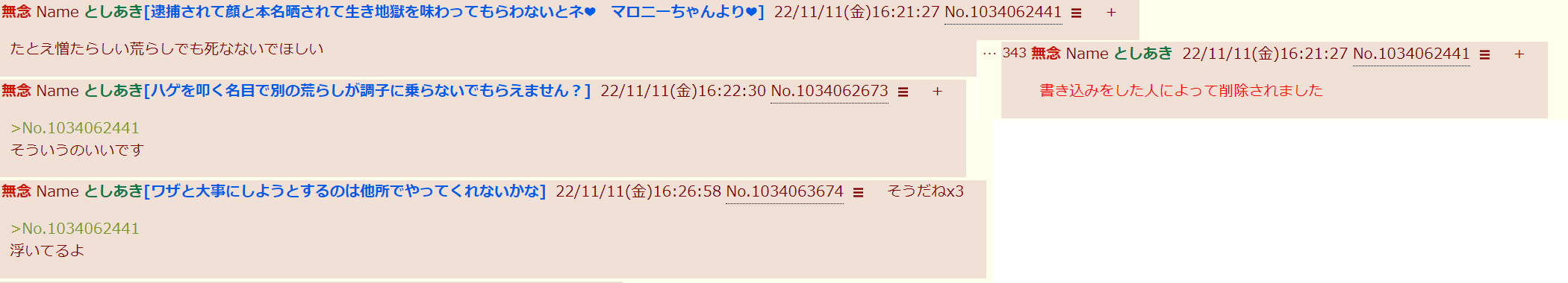 | … | 61無念Nameとしあき26/01/24(土)21:04:05No.1382438228そうだねx1>妄想の荒らし作ってオフ会やるガイジなんて親が泣いてるに決まってるだろ |