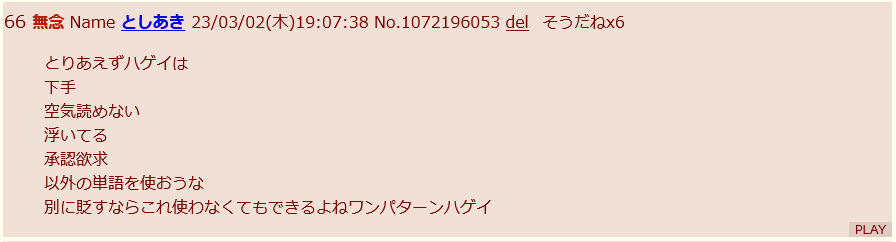 | … | 36無念Nameとしあき26/01/24(土)20:47:02No.1382433227そうだねx2>悪態が全部スレ画に収束するの好き |