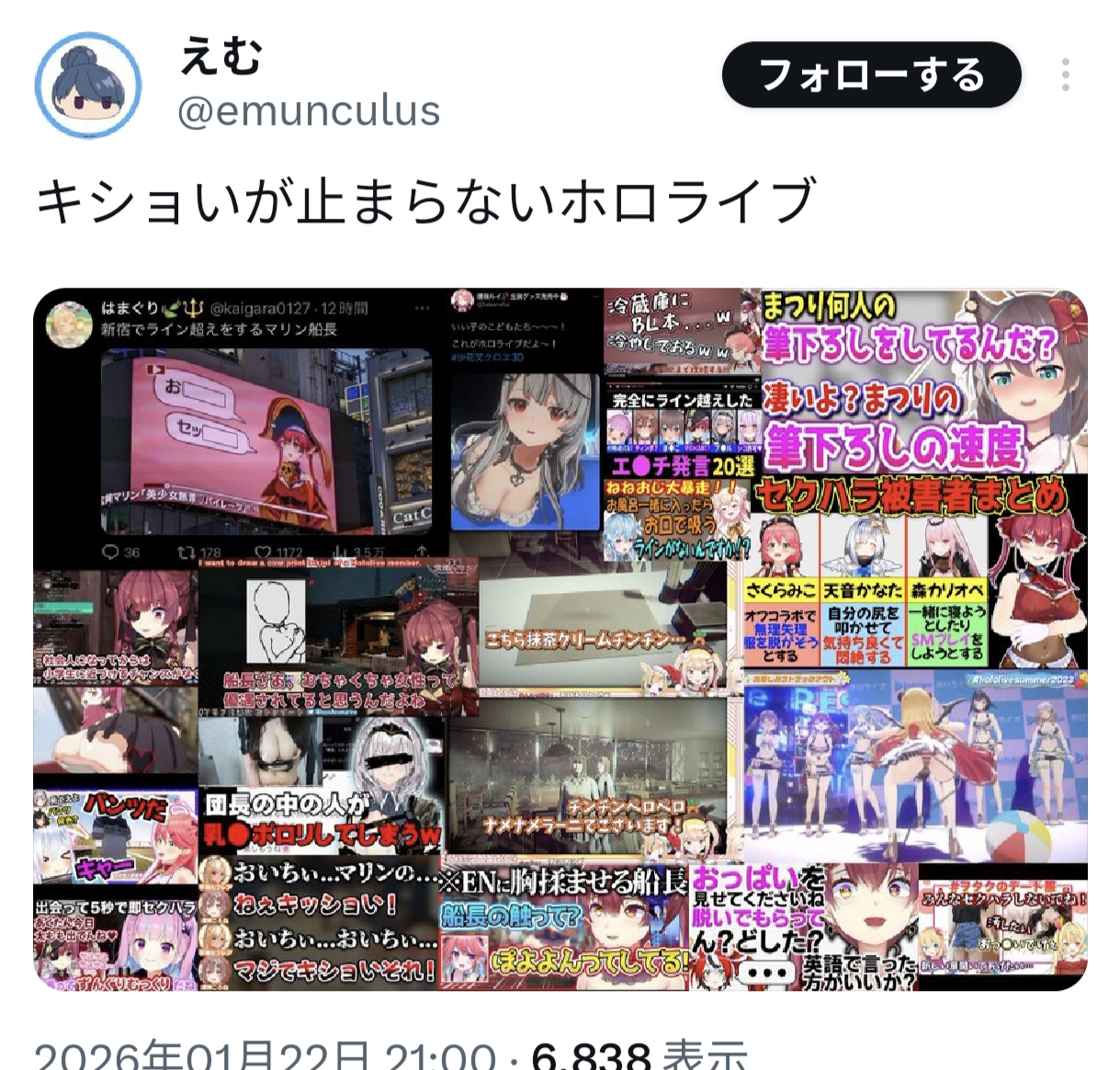 | … | 86無念Nameとしあき26/01/24(土)21:04:30No.1382438372+>一方のホロライブは世の中舐め腐るムーブをしているのを感じ取ってハロワ行けと殴り合いをしたとか |