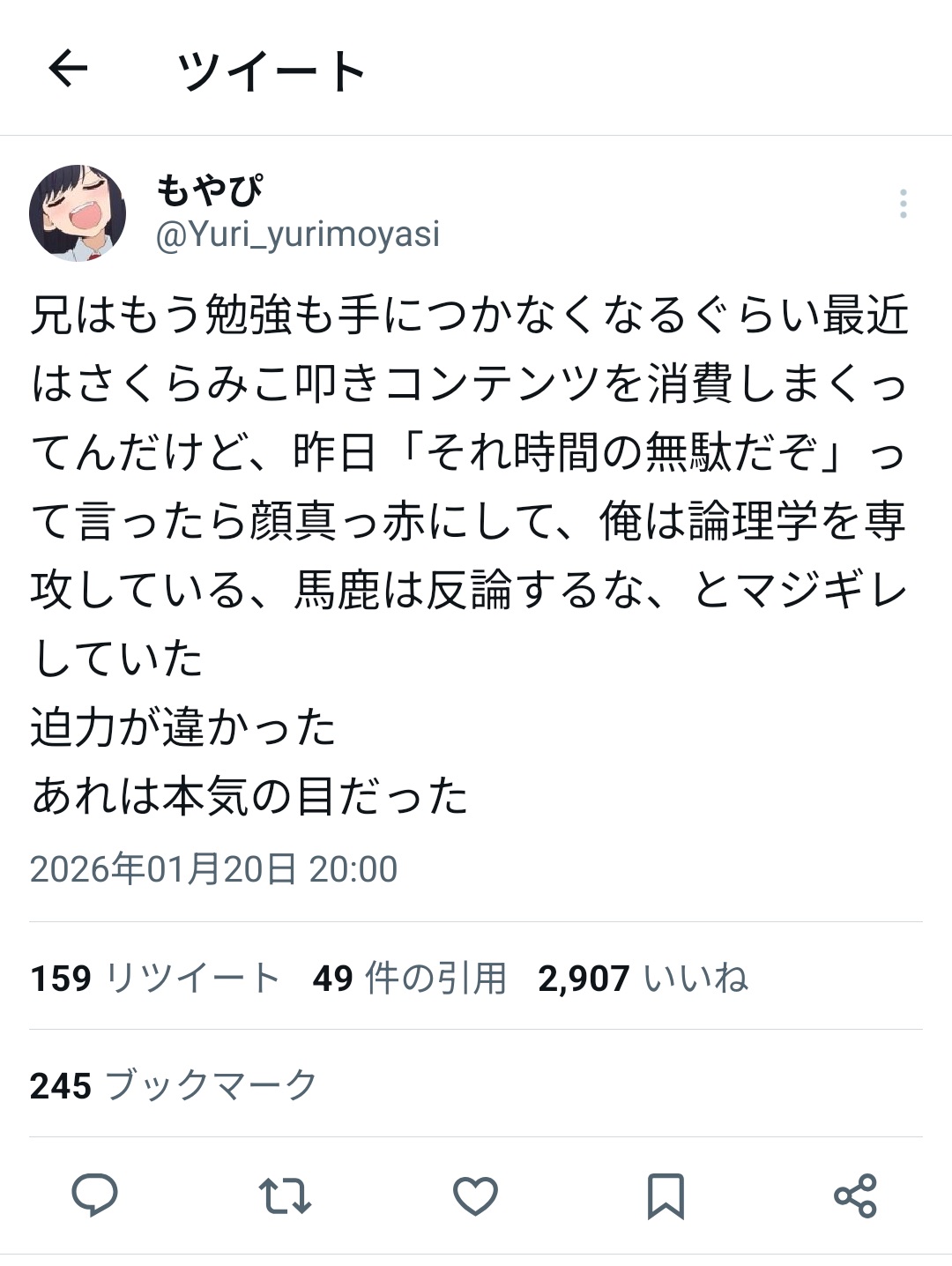 | … | 289無念Nameとしあき26/01/24(土)21:40:35No.1382448907そうだねx6 1769258435727.jpg-(41944 B) >>浪人兄貴は妹悲しませないで早く受験受かるように頑張れや! |
