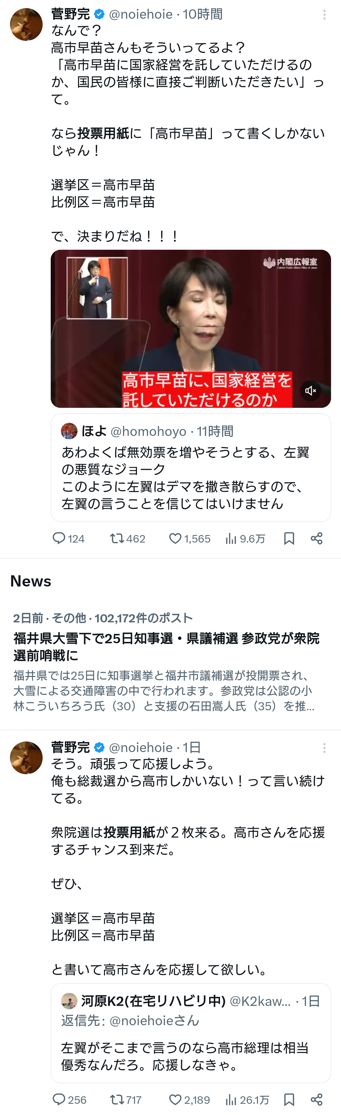 | … | 652無念Nameとしあき26/01/24(土)23:54:28No.1382486110+開票日まで野田が持つのかが焦点になっちまいそうだな |