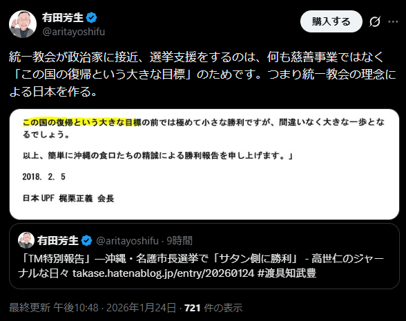| … | 94無念Nameとしあき26/01/24(土)21:18:25No.1382442440そうだねx14>自民党に票やる連中は統一教会の信者とみなす |
