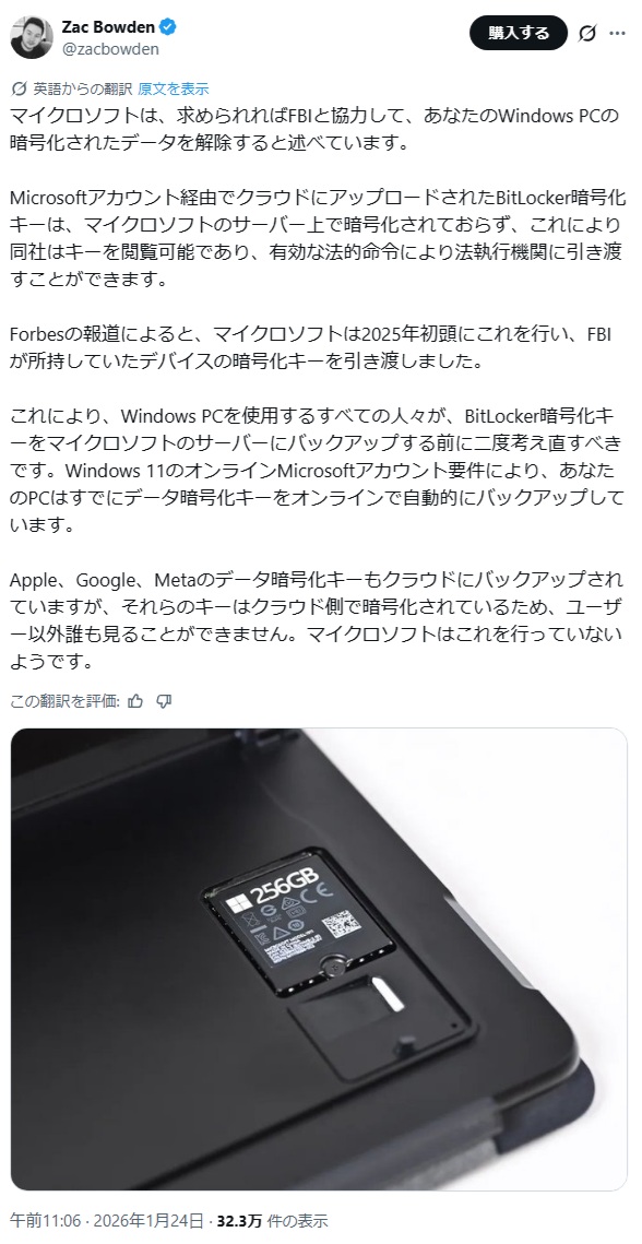 裁判所命令によりBitLockerキーがFBIに提供されたことが確認される