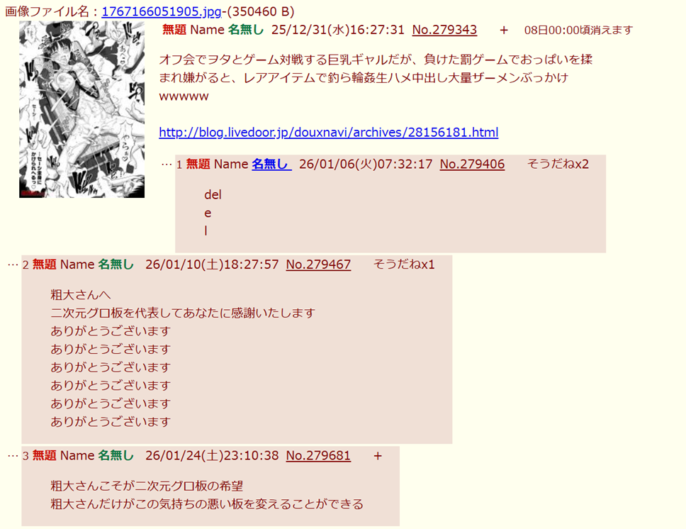 | … | 37無念Nameとしあき26/01/24(土)23:23:54No.1382478325+殺害予告性犯罪者河村ヤッチャイ |