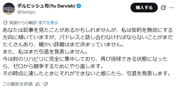 | … | 19無念Nameとしあき26/01/25(日)07:59:19No.1382525011+>現時点で引退を発表するつもりはない。今はリハビリに集中していて、再び投球できる状態になったら、ゼロからやり直すつもり。そこまで到達した段階で、もう戦う準備ができないと感じた場合に引退を発表することになると思う |