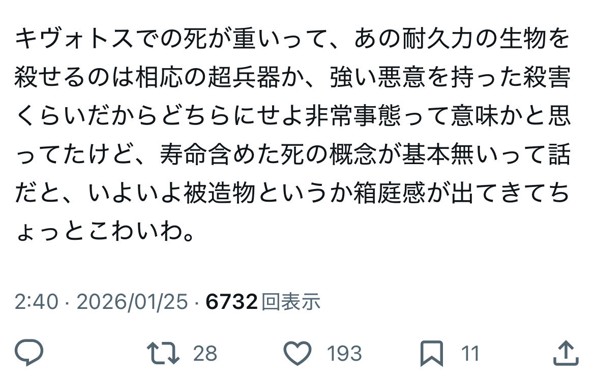 | … | 242無念Nameとしあき26/01/25(日)11:03:41No.1382560134+>なんか今回で神秘ある奴は死なないみたいな話出てきたけど |