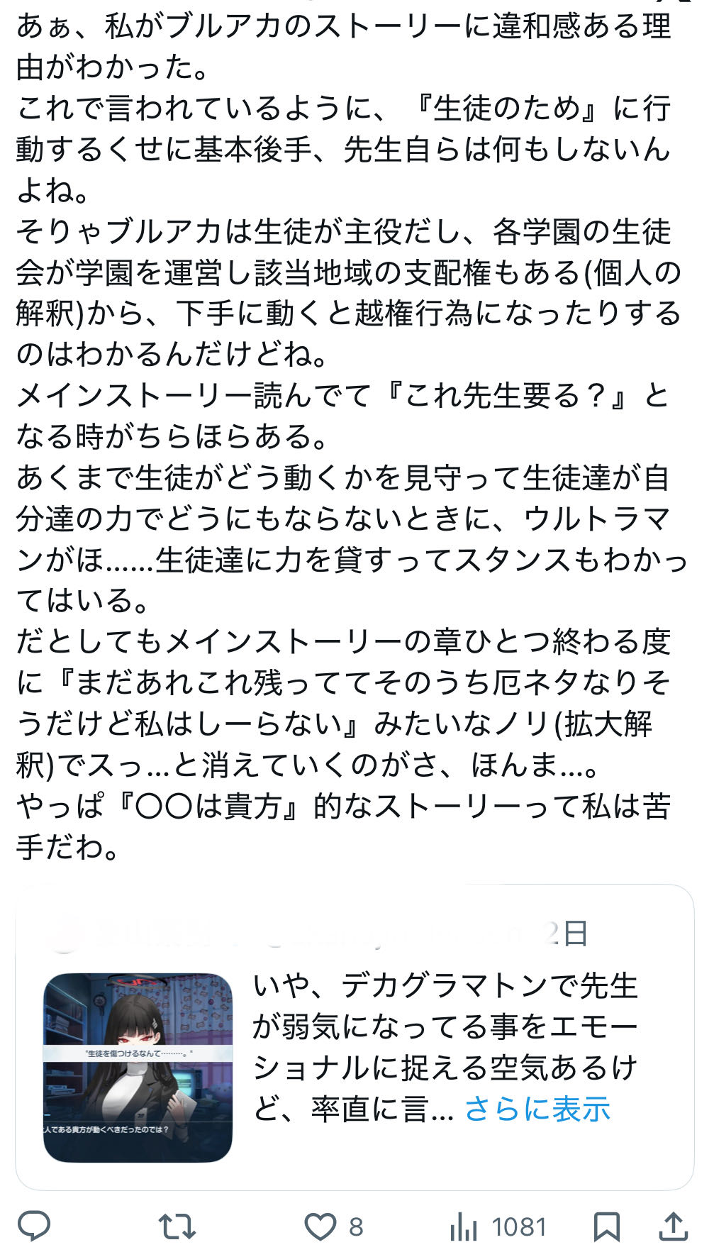 | … | 27無念Nameとしあき26/01/25(日)09:49:01No.1382544420そうだねx21 1769302141110.png-(1502610 B) >ブルアカが良かったところはイラストはまぁまぁよかったところかな(過去形) |