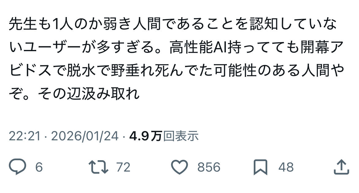 | … | 245無念Nameとしあき26/01/25(日)11:04:35No.1382560338+>>>(舌戦なら負け無しの超人じゃなかったのか…?) |