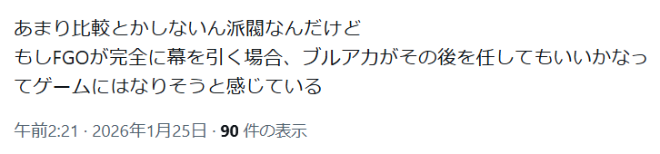 | … | 308無念Nameとしあき26/01/25(日)11:20:03No.1382563667+>FGO継ぐなら設定見直して映画とかアニメに力入れて欲しいわよ… |