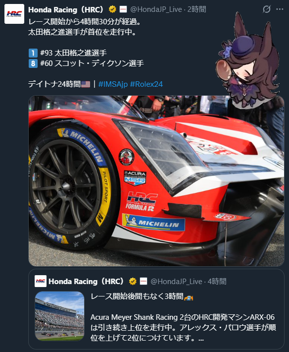 | … | 96無念Nameとしあき26/01/25(日)10:52:58No.1382557859そうだねx1 1769305978089.png-(449925 B) サッカーの話がありましたが現在はデイトナ24hでアキュラ(ホンダ)ががんばってます |