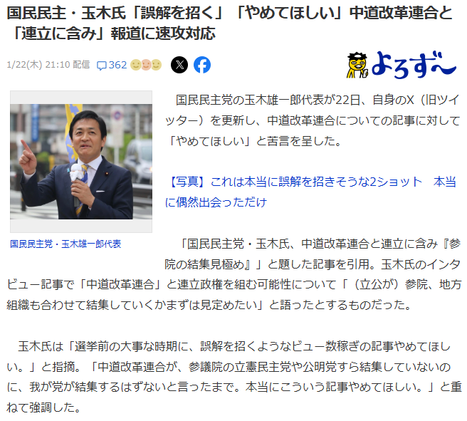 | … | 102無念Nameとしあき26/01/25(日)16:31:47No.1382634311+>玉木は中道に対しては至極真っ当な事しか言ってないのに |