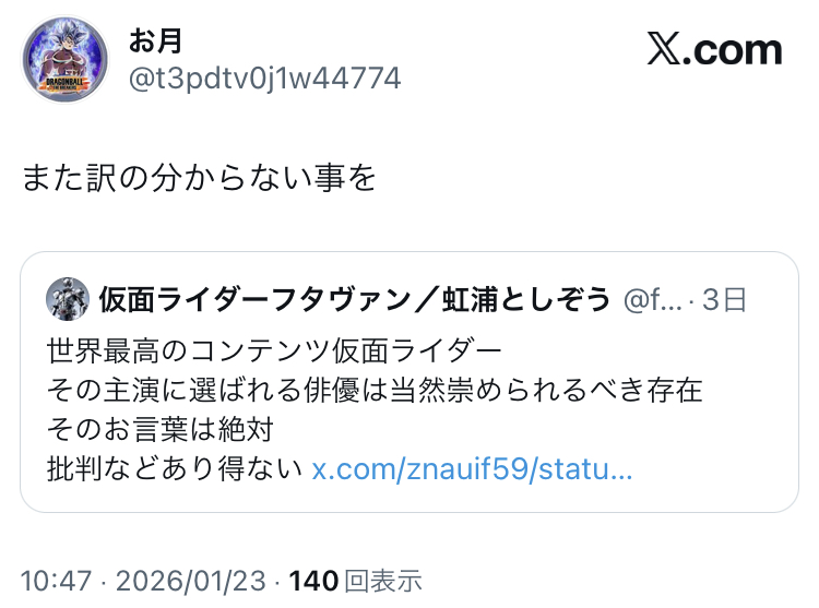 | … | 194無念Nameとしあき26/01/25(日)17:20:39No.1382646457+>すごいよね口調がとにかく浮いてるし攻撃的だし |