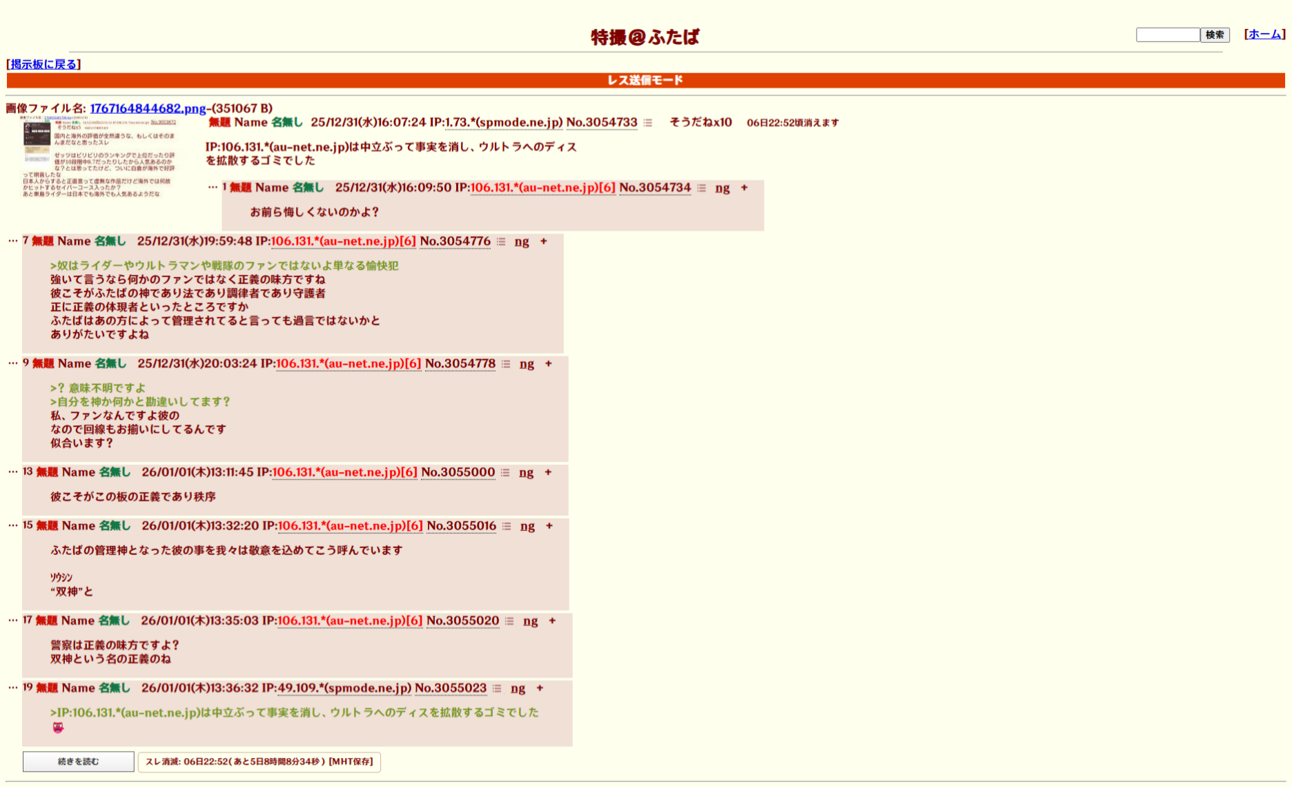 | … | 48無念Nameとしあき26/01/25(日)16:27:33No.1382633277そうだねx7>いい歳してウルトラマン粘着かよ、スレ豚 |