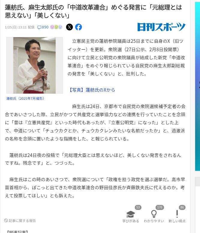 | … | 26無念Nameとしあき26/01/25(日)20:36:06No.1382697959+ 1769340966191.jpg-(122776 B) 蓮舫に元総理とは思えない美しくないと言われる |