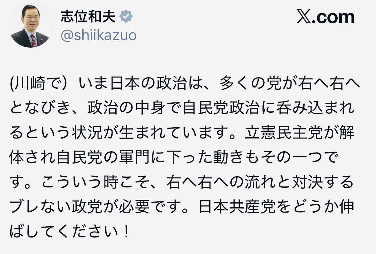 | … | 959無念Nameとしあき26/01/25(日)22:24:10No.1382731261+政策が与党だった公明党のコピーなんだから立憲は政党として死んだ |