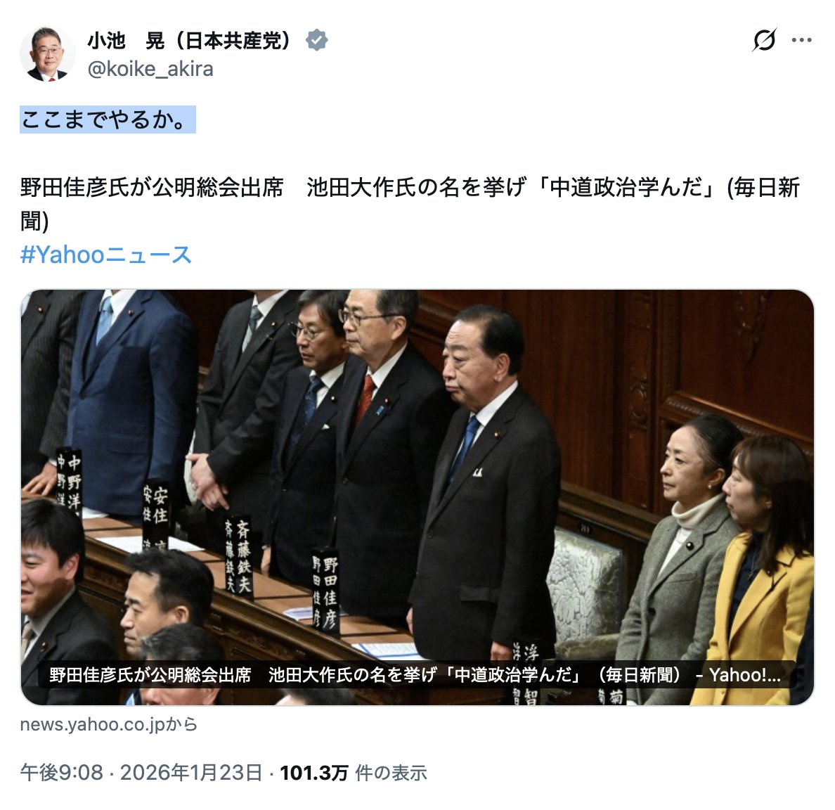 | … | 920無念Nameとしあき26/01/25(日)22:19:53No.1382730077そうだねx3>まあ今後野党共闘なんて言えない状況になるのは確実 |