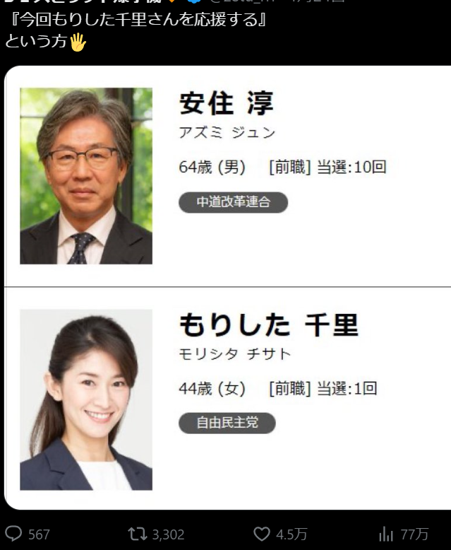 | … | 980無念Nameとしあき26/01/25(日)22:27:53No.1382732287+自分とこの選挙区だと前回は維新自民国民で票食い合ったから今回どうなんだろうな |