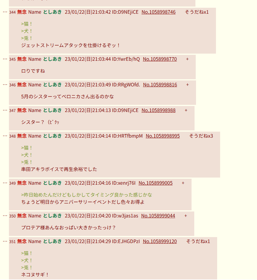 | … | 22無念Nameとしあき26/01/25(日)21:50:58 ID:8s59j1vwNo.1382721918+>イベント予定で猫イベ犬イベ兎イベって並んでいた模様 |