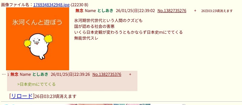 | … | 19無念Nameとしあき26/01/26(月)00:50:46No.1382762919+>氷河期世代世代という人間のクズども |