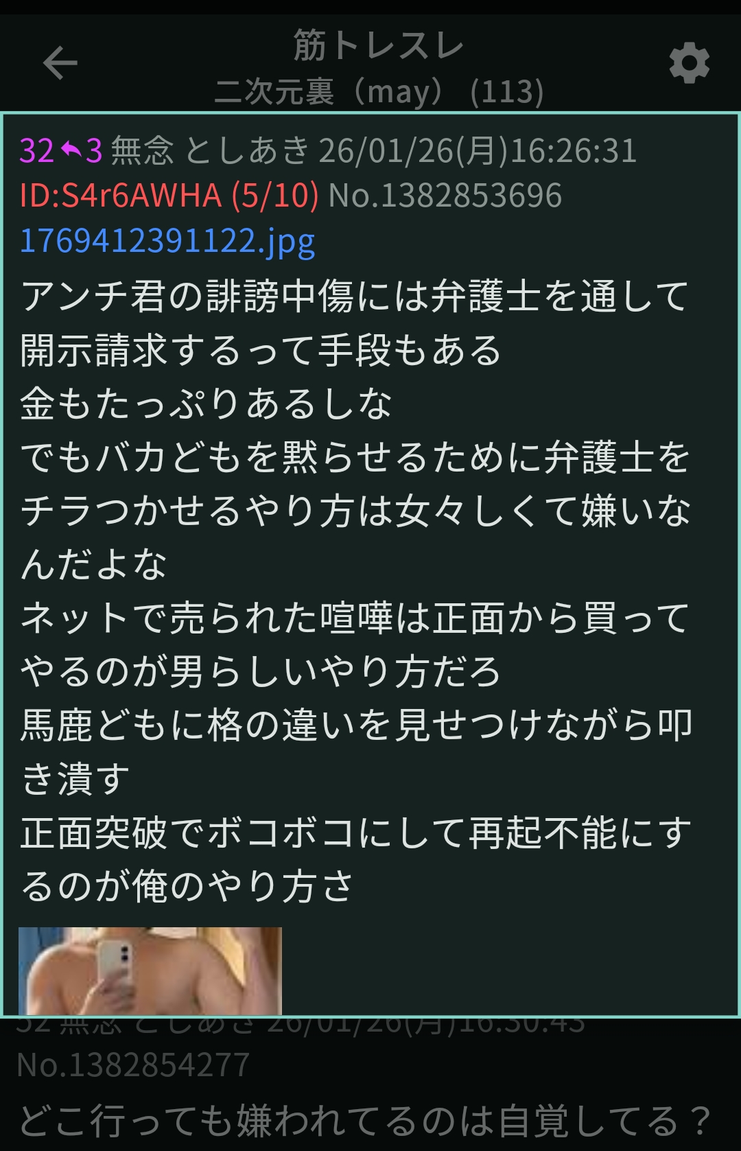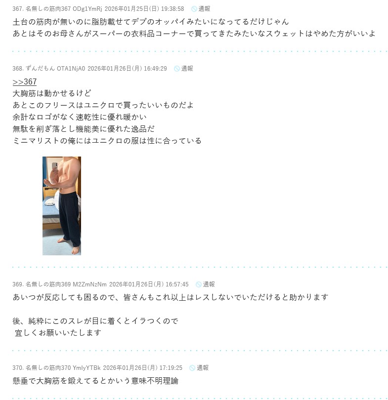 | … | 55無念Nameとしあき26/01/26(月)18:23:37No.1382872209+>そう言えば筋トレスレで「開示請求」の言葉を出した瞬間アンチ君がざわつき始めたな |